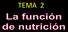 TEMA 2 LA FUNCIÓN DE NUTRICIÓN 1 PUNTO 1: LA FUNCIÓN DE NUTRICIÓN La nutrición es el proceso por el cual los seres vivos toman sustancias del exterior para obtener materia y energía. Las sustancias que